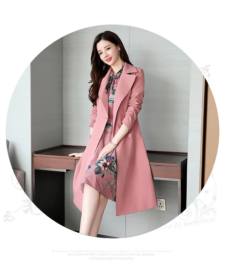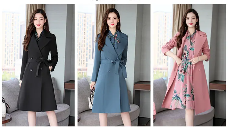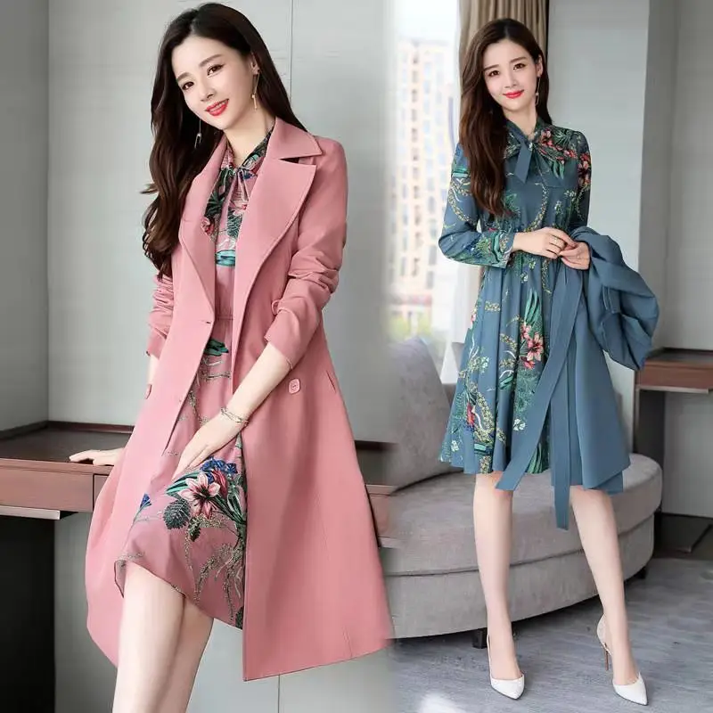 Spring Autumn Ladies Dress Suits for Office Wear Long Trench Coat and Knee Length Dress 2 Piece Set